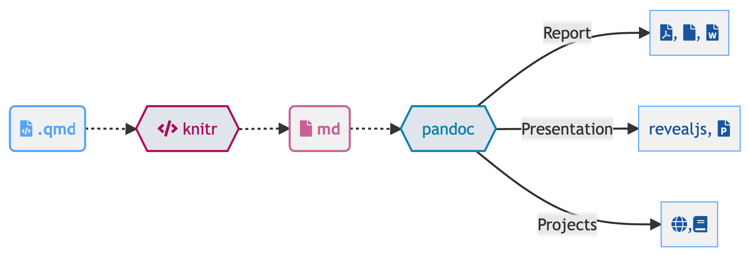 knitrknitrknitr or jupyter evaluates R/Python/Julia code and returns a .md file along with the evaluated code.md file by Pandoc and converted to a final output format